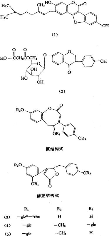 释义 | 葛根 【概况】: 异名 粉葛(《草木便方》),甘葛(《滇南本草》),葛麻茹(《陆川本草》),葛子根(《山东中药》),黄葛根(《四川中药志》),葛根条(《陕西中药志》)。 基源 为豆科葛属植物几种葛的块根。 原植物 葛(《诗经》)Pueraria lobata(Willd.)Ohwi[Pueraria thunbergiana(S.et Z.)Benth.;P.hirsuta(Thunb.)Schneid.;P.pseudo-hirsuta Tang et Wang],又名野葛(《纲目》)。甘葛Pueraria thomsonii Benth.,又名葛麻藤(《天宝本草》)。 历史 本品始载于《本经》。 《纲目》载:“葛有野生,有家种。其蔓延长……其根外紫内白,长者七、八尺。 其叶有三尖,如枫叶而长,面清背淡。其花成穗,叠叠相缀,红紫色。 其荚如小黄豆荚,亦有毛。其子绿色。 ”以上描述野生者即为本品。家种者系指甘葛,中国南方多有栽培。 现两者均作药材收购。 形态 葛 藤本,长达10m,植株被黄褐色硬长毛。块根肥厚。3出羽状复叶,具长柄,顶端小叶柄较长;托叶盾状著生;小叶卵状扁长圆形或菱形,上缘有2或3裂,长8~19cm,宽6.5~18cm,先端渐尖,基部圆形,两面均被糙毛;侧生小叶略小。 总状花序短于叶,花30朵以上,密集于花序轴上部;小苞片卵形或披针形;花萼钟状,长0.8~1cm,萼齿5,与萼筒近等长,两面均被黄柔毛;花冠蓝紫色或紫色,长1.2~1.5cm,旗瓣近圆形或卵圆形,先端微凹,基部具2个短耳,翼瓣长圆形,基部有耳,龙骨瓣略长于翼瓣;二体雄蕊;子房线形,花柱弯曲。荚果线形,长5~9cm,宽0.7~1cm,表皮被黄褐色长硬毛。 种子扁圆形,赤褐色,有光泽。花期4~8月,果期8~10月。 (图见《中药志》.第1册.第2版.彩图25) 生境与分布 生于山坡、疏林阴湿处。 中国除西北外,均有分布。 甘葛 藤本、茎被黄褐色短毛及侧生长硬毛。根粗壮肥厚。 3出羽状复叶,柄甚长;托叶长圆披针形,被毛;小叶近菱状宽卵形,长9~21cm,宽8~18cm,自叶缘中上部3裂,先端短渐尖,基部圆形。总状花序短于叶,小苞片卵形;花萼钟状,萼齿5,长于萼筒,被黄褐色硬长毛,花冠紫色,长1.3~1.8cm。荚果条形,长10~12cm,宽1~1.2cm,表皮密被黄褐色硬长毛。种子8~12粒,肾形或近圆形,褐色。 花期6~9月,果期8~10月。(图见《中药志》.第1册.第2版.564页.图454) 生境与分布 分布于广东、广西、四川和云南等省区。 。【生药】:栽培 宜温暖潮湿环境,需栽培于土层深厚、疏松肥沃的砂质壤土。 多用无性繁殖。在夏季生长繁茂时,选取健壮枝条,用波状或连续压条法,将葛藤埋入土中或用土堆压节上,未压埋部分应突起土面,待茎节处生根后切下栽植;或将1~2年生的藤茎,剪成插条,每隔2~3个节剪成1段,扦插于苗床,生根成活后移栽;也可在春季挖取株旁萌生的嫩枝,分株栽植。 一般在秋季移栽定植,栽前按行株距1.5×1m开穴,深33cm左右,每穴施入堆肥或粪肥后,覆上薄土,然后栽植,每穴栽1~2株。 栽后注意中耕除草,每年追肥1~2次,以磷、钾肥、厩肥为佳。 当藤长2m时,须摘去顶芽,促使分枝。另外,可用种子播种育苗繁殖,于3~4月播种。 主要虫害金龟子,用灯光诱杀或用90%晶体敌百虫1000倍液防治。 采集 秋、冬季采挖根,野葛多趁鲜切成厚片或小块,干燥;甘葛藤多除去外皮,用硫黄熏后,稍干,截段或再纵切两瓣,干燥。 野葛中国大部分地区有产,以湖南、河南、广东、浙江、四川为主。 甘葛藤多为栽培,主产于广东、广西、四川、云南也产。 鉴别 性状 野葛根圆柱形,商品常为斜切,纵切或横切的片块,长4~36cm,直径4~14cm,厚0.5~1cm;外皮淡棕色,有纵皱纹,粗糙;切面黄白色,纹理不明显。质韧,纤维性强。 无臭,味微甜。 甘葛藤根圆柱形,类纺锤形或半圆柱形,长12~15cm,直径4~8cm,有的为纵切或斜切的厚片,大小不一;表面黄白色或淡棕色,未去外皮的灰棕色。横切面可见由纤维形成的浅棕色同心性环纹,纵切面可见由纤维形成的数条纵纹。体重,质硬,富粉性。 气微,味微甜。以块大、质坚实、色白、粉性足、纤维少者为佳。 显微 野葛根横切面:商品葛根皮部多已除去。木质部射线宽3~8列细胞,波状弯曲。导管直径可达300μm,10~20余个成群,与木纤维束相间排列;纤维束极多,常数束成群而排列成环,纤维壁木化,纤维束周围的薄壁细胞中含草酸钙方晶。所有薄壁细胞中含少量淀粉粒。(图见《中药志》.第1册.第2版.566页.图455)。粉末淡灰白色。 ❶ 淀粉粒极多。单粒圆球形、类圆形或椭圆形,直径3~37μm,脐点点状、裂缝状、人字状、十字状或星状,大粒层纹隐约可见。复粒多,由2~10分粒组成,较大,直径至48μm。 ❸ 导管主为具缘纹孔导管,一般较粗大,六面形或椭圆形,排列紧密。 甘葛藤根横切面:木质部导管较小,直径达76μm,多单个或少数成群散在,木纤维较少,非木化或微木化;木薄壁细胞含众多淀粉粒。 (图见《中药志》.第1册.第2版.567页.图456) 理化 取样品粗粉0.5g,加95%乙醇25ml,80°C热浸半小时,冷却后滤过,滤液蒸去乙醇,残渣加水溶解后,用氯仿洗去杂质(3次),将水溶液蒸干,用95%乙醇溶解,点于硅胶G板上,以葛根素为对照,以氯仿-甲醇(8∶2)为展开剂,展开18cm,在紫外灯下观察,葛根素显蓝色荧光斑点。(图见同上.图457) 加工炮制 煨葛根,取麦麸撒在热锅中,加热,俟冒烟时,加入葛根片,拌炒至葛根片呈焦黄色,取出,筛去焦麸,放凉。每葛根片100kg,用麦麸30kg。 贮藏 置通风干燥处,防潮,防蛀。 。【化学】:根含大豆素(Daidzein)约0.13%、大豆甙(Daidzin)约0.13%、大豆素-4′,7-二葡萄糖甙、葛根素(Puerarin)、葛根素-7-木糖甙、4′,6″-O-二乙酰葛根素,淀粉10%~14%[1]。 从葛根中得到