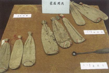 蒙医以“赫依”、“希拉”、“巴达干”三根的关系来解释人体的生理、病理现象。 所谓“赫依”,是指各种生理功能的动力。凡是思维、语言、动作及各脏器的功能活动,都受它支配。如果“赫依”功能失常,则会导致脏腑功能减弱,表现为神志异常、失眠、健忘等。“希拉”有火热之意。 机体的体温、各组织器官的热能及精神的振奋等都是“希拉”在发挥作用。“希拉”偏盛,就会发生各种温热病,如口苦、吐酸、神情狂躁等表现。“巴达干”是指体内的一种黏液状物质,具有寒性的特征。“巴达干”的功能失调,除了表现为一般寒性征象外,还易导致水液的停滞不化而出现各种分泌物增多的现象。  内蒙古包头五当召内收藏的蒙医用具,药勺、药袋等。 |