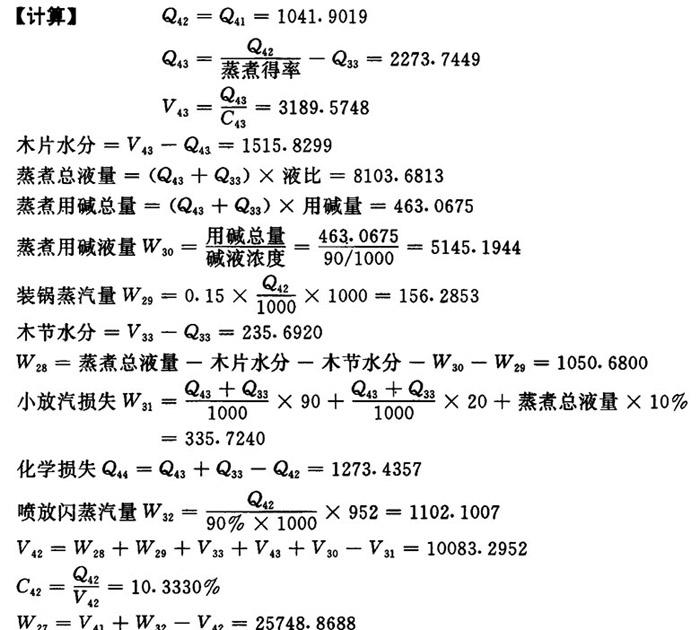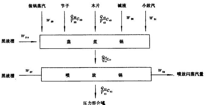 100kg绝干木片在小放汽时放出90kg蒸汽,20kg易挥发物;放出碱液为总液量的1%;液比1∶3.5;装锅用蒸汽0.15t/t绝干粗浆;喷放时每吨风干粗浆闪蒸汽量为0.952t