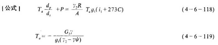 [说明]在蒸煮第一阶段开始时,锅内不发生放气,蒸煮液也不发生蒸发,因此,gu=0.g2=0锅壁温度比锅内纸浆温度高,故KS(θ-θ0)≈0,此时,其压力特征方程式可表示如下。