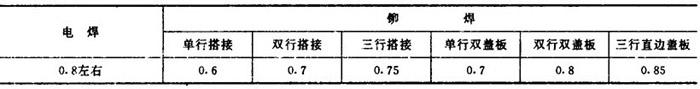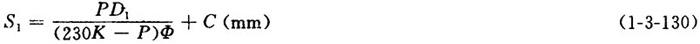 【公式】  (1kg/mm2=9.81×106Pa) K2——许用抗拉应力(kg/mm2),根据锅板抗拉强度及安全系数而定,一般在6.5kg/mm2左右 Z1——锅壁纵向强度系数,根据焊接及铆接情况而定,见表1-3-45 表1-3-45 锅壁纵向强度系数  Z2——含义同Z1,其值见表1-3-45 15%——腐蚀裕量 原苏联某研究机关提出的圆筒部钢板的厚度计算式为:  式中 S1——圆筒部钢板厚度(mm) P——最大许用工作压力(kg/mm2) D1——圆筒部直径(mm) K——许用抗拉强度(kg/mm2) Φ——锅筒壁纵向接缝强度系数 C——附加量 |