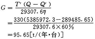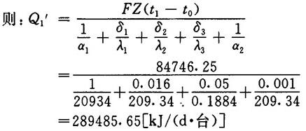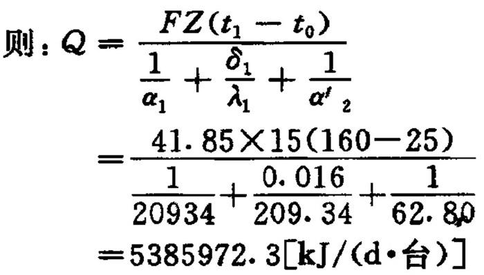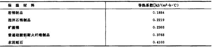 式中 α1——球内物料对球壁给热系数,取20934kJ/(m2·h·℃) α2——保温结构外表面对空气给热系数,取36.72kJ/(m2·h·℃) δ1、δ2、δ3——分别表示球壁厚度,保温层厚度和金属护壳厚度,其值分别取0.016、0.05、和0.001m λ、λ3——钢的导热系数,取209.34kJ/m·h·℃) λ2——保温层材料导热系数,见表1-2-29 表1-2-29 不同保温材料的导热系数 2.不同保温材料节约标煤比较计算 式中 G——保温层节约热能折合标煤量[t/(年·台)] T′——年生产天数,取330天 Q——无保温结构时蒸球热损失[kJ/(d·台)] Q′——有保温材料时蒸球热损失[kJ/(d·台)] 29307.6——标准煤发热量为29307.6kJ/kg(7000kca1/kg) η——锅炉热效率,取60% 【计算结果及比较】 1.蒸球无保温结构时热量损失Q 式中 α2′——球壁外表面对空气的给热系数,取62.80kJ/(m2·h·℃)