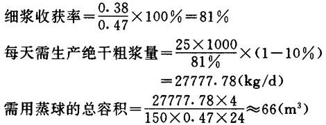 释义 | 蒸球容积和台数的选定计算 式中 V——所需蒸球总容积(m3) G——粗浆日产量(kg绝干浆/d) K——蒸煮系数[kg绝干浆/(m3·d)]