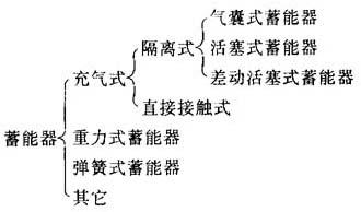 蓄能器按其作用于工作液的物质不同,一般分为充气式、重锤式和弹簧式等三类。每类蓄能器又根据其结构有不同形式的蓄能器。具体分类如下: