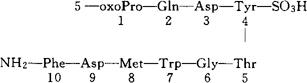 C58H73N13O21S2=1352.41 CAS-17650-98-5 5-氧代-L-脯氨酰-L-谷氨酰胺酰-L-天冬氨酰-L-酪氨酰-L-苏氨酰甘氨酰-色氨酰-L-甲硫氨酰-L-天冬氨酰苯基-L-丙氨酰胺4-(硫酸氢酯)。 5-Oxo-L--propyl--L-glutaminyl--L-aspartyl--L-tyrosylL-threonylglycyl-L-tryptophyl-L-methionyl-L-aspartylphenyl-L-alaninamide 4-(hydrogen sulfate)(ester). 诊断用药。 雨蛙肽,开如蓝。 Caerulein,Ceruletide,FI 693. INN,BAN,USAN.  |