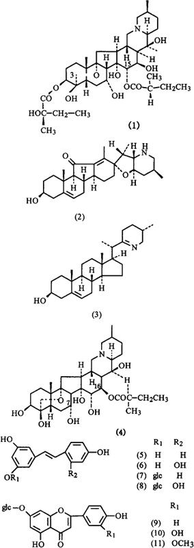 释义 | 藜芦 【名称出处】:《本经》 【概况】: 异名 黑藜芦(通称),山葱(河北、山东、山西),人头发(四川)。 基源 为百合科藜芦属植物藜芦、毛穗藜芦、天目藜芦、毛叶藜芦、兴安藜芦的干燥根及根状茎。 原植物 以藜芦作中药的有5种植物,其中藜芦Veratrum nigrum L.[V.nigrum L.var.ussuriense Loes.f.;V,nigrum L.var.microcarpum Loes.f.;V.ussuriense(Loes.f.)Nakai]大部分地区均产,应用较为普遍。 其它4种分别在产地或民间亦作藜芦入药。毛穗藜芦Weratrum maackii Regel(V.mandschuricum Loes.f.;V.oblongum Loes.f.)在东北及山东作藜芦入药。天目藜芦Veratrum schindleri Loes.f.(V.cavaleriei Loes.f.;V.maximowiczii auct.non Baker),又名邢氏藜芦(《中药志》),牯岭藜芦(《中国植物志》),在民间药用。毛叶藜芦Veratrum grandiflorum Loes.f.(V.puberulum Loes.f.),又名算藜芦(《中药志》)和兴安藜芦Veratrum dahuricum(Turcz.)Loes.f.(V.album L.var.dahuricum Turcz.)分别在当地作藜芦药用。 历史 《本经》始载之。《纲目》载入草部,毒草类。 宋《图经本草》云:“今陕西山南东西州群皆有之。辽州(今山西阳县)、均州(今湖北均县)、解州(今山西解县)者尤佳。三月生苗。叶青,似初出棕心;又似车前。 茎似葱白,青紫色,高5、6寸,上有黑皮裹茎,似棕皮。有花肉红色(与今日黑紫色的花不符)。 根似马肠根,长4、5寸许,黄白色,2、3月采根,阴干。所说即本种。 但古时混称“鹿葱”,这是不恰当的,鹿葱应是萱草的别名。 形态 多年生草本,高60~100cm。 根状茎短圆柱形,具多数细长的须根,肉质,外皮黄白色。茎直立,基部有黑褐色棕毛状的叶柄残基。 叶互生、近无柄;叶阔椭圆形,至卵状披针形,长达30cm,宽达10cm,先端渐尖,基部渐狭,下延成鞘状抱茎,上面青绿色,下面灰绿色,有强脉而具折。 圆锥花序顶生,花序轴密披灰白色绵毛;花小、杂性,雄花通常生于花序轴下部,两性花常在上部以上;花被6片,黑紫色,开展或稍下反;雄蕊6,与花被片对生,花药肾形,背著,合生为1室,子房近方形,花柱3,3室,胚珠多数。蒴果长1.5~2cm;种子具翅。花期7~8月,果期9月。 (图见《中药志》.第2册.第2版.彩图32) 生境与分布 生于海拔1200~3300m山谷、山地阴坡或灌木林下。分布于中国东北、河北、河南、山东、山西、内蒙古、江西、湖北、陕西、甘肃、新疆、四川。 亚洲北部或欧洲中部也有分布。 毛穗藜芦与藜芦的主要区别在于:叶长倒披针形,长20~40cm,宽2~6cm,基部狭窄具短柄;圆柱花序疏生较短的侧生花序,侧生花序上的花梗明显短于主轴上的花梗。 花果期7~9月。(图见《中药志》.第2册.第2版.582页.图436)生于海拔400~1700m的山地林下或高山草甸。 分布于中国东北、内蒙古和山东。朝鲜、日本和原苏联西伯利亚东部也有分布。 天目藜芦与藜芦、毛穗藜芦的主要区别为:基生叶长椭圆形或披针形,长达36cm,宽2~6cm,基部渐狭成长柄状,下连叶鞘;茎生叶披针形,无柄;花被褐绿色至褐黑色,小花梗纤细,长5~10mm。 花果期6~10月。 (图见《中国植物志》.第14卷.22页.图版2∶5~8)生于海拔700~1350m的山坡林下荫湿处。分布于江西、江苏、浙江、安徽、湖南、湖北、广东、广西和福建。 毛叶藜芦与藜芦,毛穗藜芦、天目藜芦的主要区别为:包裹茎基部的叶鞘只具平行纵脉,无横脉,枯死后残留为纵的纤维束;基部叶矩圆形至矩状椭圆形,长达20cm,宽达10cm;茎上的叶由下而上渐小,广卵形,卵状披针形至线状披针形;花被绿白色或黄绿色,边缘有明显的啮蚀状牙齿。子房密生绵状毛。 花果期7~8月。 (图见《中国植物志》.第14卷.25页.图版3∶1~5)生于海拔2600~4000m的山坡林下或湿生草丛中。 分布于中国江西、浙江、台湾、湖南、湖北、四川和云南。 兴安藜芦与以上4种藜芦的主要区别为:包裹茎基部的叶鞘只有平行纵脉,无横脉,枯死后残留为纵的纤维束;叶背面被银白色绒毛。 花期6~8月。(图见《中药志》.第2册.第2版.582页.图435)生于草甸和山坡湿草地。 分布于中国辽宁、吉林、黑龙江。朝鲜和原苏联西伯利亚也有。。【生药】: 栽培 宜冷凉而较阴湿的环境,对土壤选择不严,但以湿润、肥沃的壤土为好。 用种子繁殖,育苗移栽。10月中、下旬采收成熟种子后播种,按行距22~25cm划行条播,深2~3cm,将种子和草木灰拌混后匀撒沟中,每亩用种量1~1.5kg。 播后覆薄土稍加镇压。出苗后,注意中耕除草、匀苗和肥水管理。 第2年冬初倒苗后移栽,按行距22~26cm开3~5cm深的条沟,以株距7~10cm栽种。栽后,每年结合中耕除草,追肥2次。 春季出苗或返青后,施人畜粪水1次;冬季倒苗后,施堆肥、厩肥或草木灰1次。 采集 5~6月末抽花茎前采挖根部或连同少部分根状茎,除去地上部分的茎叶,洗净,晒干。 或挖取全草,除去泥土,晒干。中国大部分地区均产。 鉴别 性状 藜芦茎基部常呈圆柱状,外层叶鞘为黑色的网状纤维束;与根茎接触部收狭。根茎圆柱形或圆锥形,长1~4cm,直径0.7~3cm,表面棕褐色,棕黄色或土黄色,根茎上生有可达30多条须根。 须根细长,弯曲,完整者长10~20cm,直径1~5mm;表面黄褐色或灰褐色,上端具横皱纹及纵皱纹。质坚脆,易折断;断面白色,皮有腔隙,中心为淡黄色中柱,常与皮部分离。 气微,味极苦,粉末有催嚏性。 毛叶藜芦与藜芦相比,外层叶鞘为非网状的纤维束。 根茎多呈圆锥形,少呈圆柱形,直径可达6cm。须根数目可达数百条,常交织在一起,完整者长可达30cm,直径1~7mm。 兴安藜芦与藜芦相比,药材常较大,根茎直径可达7cm。茎基部呈圆锥状,外层叶