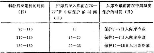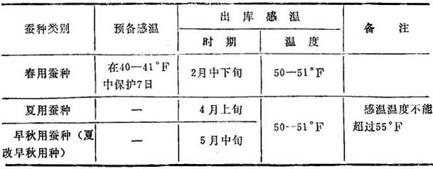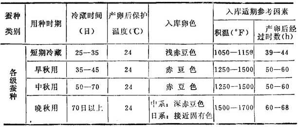 释义 | 蚕种的冷藏 (一)蚕种冷藏前的准备 1.冷库消毒 秋种出库浸酸结束后或在蚕种入库前1个月,必须对蚕种冷库的所有用房(如内、外库房,低温室、晾种室等)、各种用具及周围环境、道路等进行全面彻底的消毒,库房消毒后应及时通风,排除药味,并用吸湿机逐库除湿。消毒后进出库房、低温室等要坚持换鞋,保持洁净,防止污染。 2.设备检修 对所有的制冷设备、动力、阀门、水泵及管道进行一次全面的拆洗和检修,在蚕种入库前20日左右检修完毕并试车运转,达到主机、辅机、备用动力等运转正常,管道畅通,绝无渗漏。 (二)春用蚕种的冷藏 1.蚕种验收 蚕种送抵冷库后,根据种场的送种清单,逐批点数蚕种,检查包装质量,按《蚕种检验办法》的有关规定,以批为单位抽样检验卵量、卵质,当发现不符合要求时,应会同有关场、有关人员及时处理和纠正。 2.单式冷藏法 仅适用于春用蚕种的冷藏。蚕种送到冷库后,用5-7.5℃(41-45°F)保护,当胚子发育到甲胚子时改用10-10。5℃(50-51°F)保护,待胚子多数发育到丙1并有少数达到丙2时入库冷藏(只作1次性冷藏,直到出库为止)。冷藏温度以2℃(36°F)为中心,出库前20日以3℃(38°F)为中心,出库前10日以4℃(40°F)为中心,上述3阶段冷藏温度上下允许开差在0.5℃(1°F)以内。冷藏期限70-90日,以不超过90日为宜。各省(区)的入库、出库时间:浙江1月下旬至2月上旬入库,4月中下旬出库;四川1月下旬至2月中旬入库,4月上中旬出库;江苏2月中下旬入库,4月中下旬出库;河北3月上中旬入库、辽宁3月下旬至4月上旬入库冷藏,5月出库。 3.复式冷藏法(中途出库感温式冷藏法) 适用于春用蚕种、越年夏用蚕种、越年早秋用蚕种(即夏改早秋用蚕种)的冷藏。 (1)冷藏标准:蚕种送达冷库后用5-7.5℃(41-45°F)保护,当胚子发育到甲胚子时入库冷藏(第1次冷藏,也叫前期冷藏或甲胚子冷藏),冷藏到一定的时间(根据春、夏、早秋不同用种时间适当伸缩)后中途出库感温,待多数(90%以上)胚子发育到丙1胚子时再入库冷藏(第2次冷藏,也叫后期冷藏或丙1胚子冷藏)。冷藏温度:春用种前期(甲胚子)和后期(丙1胚子)冷藏温度均以2℃(36°F)为中心;夏用及夏改早秋用种前期(甲胚子)冷藏温度以0℃(32°F)为中心,后期(丙1胚子)以2℃(36°F)为中心;不论春用、夏用或夏改早秋用蚕种,发种前20日冷藏温度以38°F为中心,发种前10日以40°F为中心;上述冷藏温度上下允许开差在0.5℃(1°F)以内。 (2)中途出库感温处理:根据前期冷藏不超过90日,后期冷藏春用蚕种控制在30-60日、夏用和夏改早秋用蚕种控制在30-70日范围内的要求,分别安排感温时间。各级蚕种复式冷藏的中途出库感温处理标准,以浙江为例列入下表。 用50-51°F(10-10.5℃)保护,感温所需的时间,一般春用蚕种约12-18日,夏用蚕种和早秋用蚕种(夏改早秋用种)约7-12日。感温期同应解剖胚子,出现丙1胚子后隔日解剖1次,当丙1胚子达到30%时每日解剖1次,丙1胚子达到90%以上时,为入库再冷藏(第2次冷藏,后期冷藏)的适期。对胚子发育不齐的批或品种,可适当延长在41°F中的预备感温时间。夏用及早秋用种出库感温时气温较高,感温中要防止蚕种接触55°F以上的温度。 4.胚子解剖:抽取解剖蚕卵要有代表性,每个样本应抽取20-30粒蚕卵。将配制好的苛性钾液(浓度15-20%)注入烧杯内煮沸,取下烧杯后立即把解剖材料浸入碱液中,约经5-6秒钟蚕卵呈赤豆色时取出,在温水中洗去卵面碱液,再移入盛有温水的培养皿中,用吸管吸水冲射,使胚子与卵壳分离,将胚子用吸管吸出,放在载玻片上,每个样本要取完整的胚子10-15个,用40-60倍显微镜观察,记录胚子的发育阶段及其个数,为适时入库提供依据。 5.催青孵化试验 在甲胚子入库时,以批为单位抽好孵化试验的样本(一般每批2张),比一般大批蚕种早1月左右(浙江约在1月20日前后)出库感温,当多数胚子发育到丙1时入库冷藏,至3月中旬出库,按标准催青,调查孵化率和张种收蚁量,写出书面报告,供蚕种配发时参考。 6.蚕种出库配发 蚕种出库(出内库)后,先在45-50°F(7-10℃)的外库中保护,普通种不少于12小时,原种以上各级蚕种不少于24小时(胚子发育不齐的品种在外库的保护时间可延长到2-3日),然后正式出库(出外库),将蚕种移入低温室中用59-63°F(15-17℃)保护待运。发种由专人负责,凭蚕种配发清单,经发种、领种双方核对无误后出运蚕种。蚕种出运应掌握在丙2胚子时进行,高温时应在早晚出运,力避日中高温。 (三)秋用蚕种的冷藏 1.防病隔离 春制秋用蚕种(毛种)送库时,正值夏用蚕种(净种)大批出库,两类蚕种保护的低温室和出入通道应严格分开,两类不同的蚕种分别放置,防止病原扩散,污染净种。 2.点收蚕种 蚕种送到冷库后,根据送种清单逐批逐架(线架)点收,逐场编号。点收后的蚕种放入低温室保护,温度75-77°F(24-25℃)、干湿差3-4°F(相对湿度约80-85%),避免接触80°F(26.5℃)以上的高温,注意通风换气。 3.适时入库 各类蚕种入库适期见下表。 4.冷藏标准 入库后40日以内,冷藏温度以40°F(4.5℃)为中心,40日以后直到出库浸酸以38°F(3℃)为中心,温度上下开差不得超出1°F。各期蚕种的入库冷藏,都要先在外库10-13℃(50-55°F)保护12小时,再入内库冷藏。 (四)黑种冷藏 在长江流域等蚕区,黑种冷藏是作为弥补秋种不足的一种临时措施而采用的。即,当入库秋种数量不足时,采用春制蚕种黑种冷藏法来补足。方法:将产卵后未满10日的原种和产卵后
