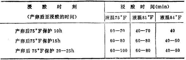 | 释义 | 蚕种的浸酸 (一)浸酸前的准备 1.检修设备,配足用具 于浸酸前半个月完成浸酸设施设备的拆洗、检修和更新,配足浸酸用具、物质和消耗性材料。 2.清洗消毒、防止污染 对浸酸场所、晾种室、称量室、低温室及周围环境进行全面的清洗消毒,安排好浸酸前毛种和浸酸后净种的出入通道,严防净种污染。 3.鉴定盐酸,确保安全 在浸酸前一个月做好盐酸的生物试验,发现有问题的盐酸不用,未经生物试验的盐酸也不能使用。生物试验采用常温浸酸法,蚕种在68°F(20℃)盐酸液中浸10分钟或在68-76°F(20-24.5℃)浸8分钟取出,脱酸干燥后,观察死卵发生及孵化情况,如孵化严重不齐或不孵化,该坛盐酸不能用于浸酸。 (二)即时浸酸孵化法 1。浸酸标准 盐酸液温46℃(115°F),盐酸比重1.072,浸渍时间:中系品种和以中系为母体的品种5分钟,日系品种和以日系为母体的品种5.5分钟,杂交种以母体为准,有滞育卵的多化性品种可适当缩短。 2.浸酸适期 以积温500-600°F(积温从盛产卵下1小时起计算,产卵面积满蚕连纸50%左右为盛产卵时间)范围内为浸酸适期,一般中系达500°F、日系达550°F时可以浸酸,并根据当时气温适当伸缩,如气温在70°F(21℃)左右时,浸酸积温可在上述范围内偏高,如气温在80°F(26.5℃)以上时浸酸积温可偏低。 3.冷藏抑制后浸酸 当即时浸酸蚕种数量不多时,可采取先冷藏抑制后浸酸的办法。当蚕种积温接近500°F时,入库在38°F(3-3.5℃)中冷藏,可抑制2-3日,蚕种入库、出库均需在中间温度50-55°F(10-13℃)保护2小时,然后再在自然温度中保护2小时后浸酸。 (三)冷藏浸酸孵化法 浸酸标准:盐酸液温47。8℃(118°F),盐酸比重1.094,浸演时间:中系和以中系为母体的品种6分钟,日系和以日系为母体的品种6.5分钟,杂交种以母体为准,有滞育卵的多化性品种浸渍时间可适当缩短。 (四)常温浸酸孵化法 盐酸比重1.110(浓度约22%),浸渍时间因盐酸液温、产卵后至浸酸之间的经过时间而异,安全浸渍时间如下表。