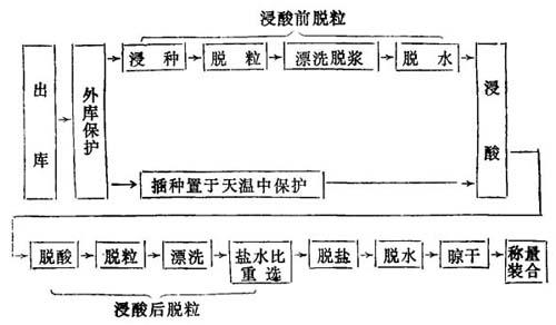 (五)浸酸程序 即时浸酸、冷藏浸酸的操作程序基本相同。 1.散卵 有先脱粒后浸酸和先浸酸后脱粒两种方式,图示如下。