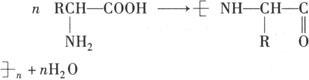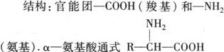 1.元素组成 蛋白质是一类结构非常复杂的化合物,由碳、氢、氧、氮、硫等元素组成. 2.单体——氨基酸 蛋白质在酸、碱或酶的作用下能发生水解,水解的最终产物是氨基酸. 概念:羧酸分子中烃基上的氢原子被氨基(—NH2)取代的衍生物叫做氨基酸.  性质:氨基酸是一种多官能团衍生物,既可以体现—COOH的性质,又可以体现—NH2的性质. (1)两性:   (2)缩合反应(或缩聚反应): a.两分子氨基酸缩合形成二肽.如:  b.分子内或分子间缩水成环,如  c.缩聚形成高分子化合物:  3.几种常见的氨基酸: (1)氨基乙酸(俗称甘氨酸):H2N—CH2—COOH (2)α—氨基丙酸(俗称丙氨酸):  (3)α—氨基—β—苯基丙氨酸(俗称苯 丙氨酸)  (4)α—氨基戊二酸(俗称谷氨酸)  |
