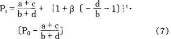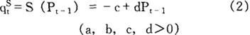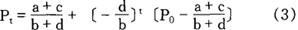 在这里P、q、D、S、t分别表示价格、产量、需求函数、供给函数与时间的期数。给定初始条件Pt|t=0=P0,在均衡时 bPt+dPt-1=a+c 其解为: