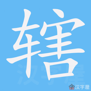 字源解说 害,既是声旁也是形旁,是“割”的本字,表示切割。辖,篆文 = (车,借代轮子)+ (切割),造字本义:切入车轴、使车轮不致脱离车轴的铁件。 附 文言版《説文解字》:轄,車聲也。从車害聲。一曰轄,鍵也。 附 白话版《说文解字》:辖,车辆运行时发出的杂音。字形采用“车”作边旁,“害”作声旁。一种说法认为,“辖”是插在车轴两端控制车毂的栓子。 引申线索