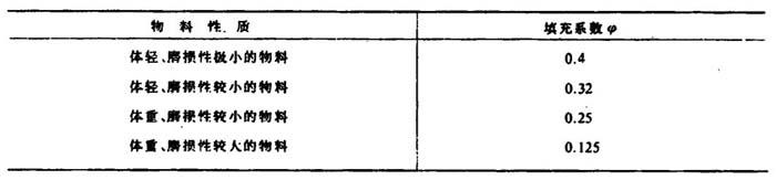 释义 | 螺旋外径的计算 式中 D——螺旋外径(m) G——螺旋输送机生产能力(t/h) n——转速(r/min) γ——物料堆积重度(t/m3) φ——填充系数,见表2-4-17 a——螺距与外径的比值 可根据设备型号,从设备目录中查取a和DS——螺旋导程,即螺距(m) 表2-4-17 填充系数φ |
