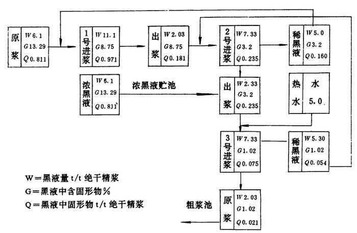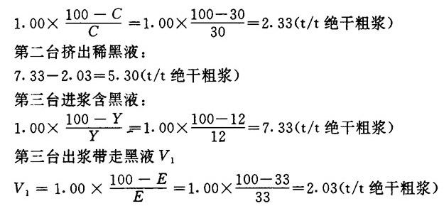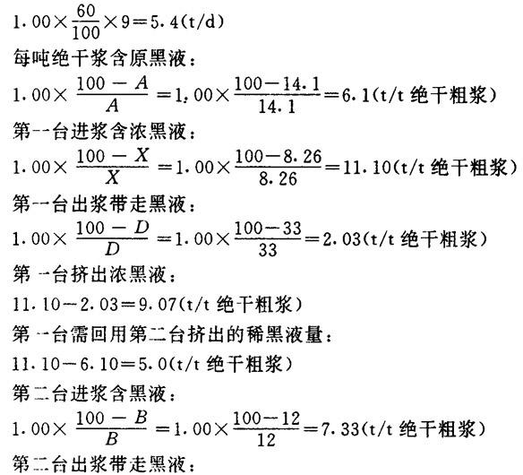 释义 | 螺旋挤浆机的计算 (一)生产能力的计算 已知条件: 每球装绝干蔗渣(t):1.00 蒸煮粗浆得率(%):60 每天蒸煮球数(个):9 原浆浓度A(%):14.1 原黑液相对密度(20C):1.052 波美度(20C)(°Bé):7.0 固形物含量(%):13.29 第一台螺旋挤浆机进浆浓度X(%):8.26 出浆浓度D(%):33.0 黑液中固形物(%):8.75 第二台螺旋挤浆机进浆浓度B(%):12 出浆浓度C(%):30 稀黑液含固形物(%):3.2 第三台螺旋挤浆机进浆浓度Y(%):12 出浆浓度E(%):33 稀黑液含固形物:1.02 挤出黑液相对密度(20℃):1.037 波美度(20C):(°Bé):5.0 含固形物(%):8.75 解: 每天绝干粗浆产量: 第三台挤出稀黑液: 7.33-2.03=5.30(t/t绝干粗浆) 第三台进浆稀释洗涤用热水L L=7.33-2.33=5.00(t/t绝干粗浆) 每天耗用清水量: 5.0×5.4=27(t/d) 第一台进浆黑液中总固形物: 11.00×8.75%=0.977(t/t绝干粗浆) 第一台出浆带走黑液总固形物: 2.03×8.75%=0.181(t/t绝干粗浆) 第一台挤出浓黑液总固形物G G=9.07×8.75%=0.79(t/t绝干粗浆) 原黑液中总固形物G0 G0=6.10×13.29%=0.811(t/t绝干粗浆) 第一台回用稀黑液与第二台挤出稀黑液量相等,即: 0.971-0.811=0.160(t/t绝干粗浆) 回用稀黑液含固形物: 0.160× 第二台进浆黑液中总固形物: 7.33×3.2%=0.235(t/t绝干粗浆) 第二台出浆带走黑液中总固形物: 2.33×3.2%=0.075(t/t绝干粗浆) 第二台回用稀黑液与第三台挤出黑液量相等,即: 0.235-0.181=0.054(t/t绝干粗浆) 第二台回用稀黑液含固形物: 0.054× 第三台进浆黑液中总固形物: 7.33×1.09%=0.075(t/t绝干粗浆) 第三台出浆带走黑液总固形物V2 V2=2.03×1.02%=0.021(t/t绝干粗浆) ❷ 物料平衡表 见表1-6-1。 ❸ 黑液利用度(洗涤效率)η: η= ❹ 稀释因子D 表1-6-1 物料平衡表 D=L-(V1-V2) =5.0-(2.03-0.021) =2.991(t/t绝干粗浆) |