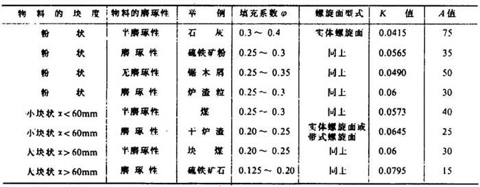 [说明]为了保证在一定运输量下既能使物料向前推进,又不使物料因受切向力太大而被抛起,螺旋运输机的螺旋轴有一极限转速,可用下式计算。  式中 nc——极限转速(r/min) A——极限速度系数,见表2-4-18 D——运输没有强烈粘性物料时的螺旋直径(m),计算后,应圆整到标准值  K——物料综合特性经验系数,可由表2-4-18查得 其它同上 表2-4-18K值与A值表  [附注]我国GX型螺旋运输机的螺旋直径系列为:150、200、250、300、400、500、600mm;其螺旋轴转速系列为:20、35、45、60、75、90、120、150、190r/min。 |