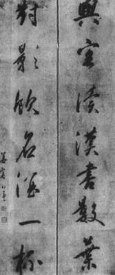 释义 | 行书七言联 【简介】: 淸·姜宸英书。纸本。行书。七言联一则。上下联正文十四字,款四字,共十九字。刊于《历代楹联名迹》。 【赏析】: 此幅行书七言联墨迹,书卷之气横溢,有董其昌书风之飘逸,又见晋书之劲挺秀韵。彷彿书家同所书月光下对酒论诗文情景一样怡然自得。上、下联字与字繁简空白对应有致,点划节奏,起笔落笔,萦带分明。中锋行笔,上下起承潇洒自如,眞可谓:妙在以自己性情合古人神理。 |
