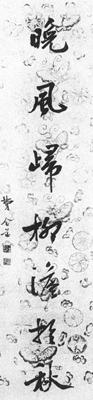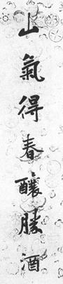 【赏析】: 此幅行书作品取法“二王”和唐代李邕,其风格笔致挺拔,秀逸醇雅。从用笔来看,入笔轻巧,收笔厚重,方圆兼用,因此在俊秀中也有凝重感。作品中的点画特别富于变化,如上联“山”字的两竪变爲两点;“酿”字、“胜”字的右旁上部的点画处理,以及下联中“柳”字的末笔变竪画爲重点,“澹”字的右下“口”也作点画处理,这些“点”的运用非常巧妙,在通篇字裏显得生动活泼。同时在整幅作品中,行楷相间,左低右高,使整幅作品笔势跳动,显示出运动的节奏感。 此幅作品从结构来看,就一个字来说,左右两部分不对称、不平衡,如“春”字本来可以做到左右平衡、对称的,但现在打破这种对称平衡;如“秋”字也可以做到对称平衡的,现在也打破这种平衡,还有许多字细看都打破了这种对称平衡。于是在疏密上作了新的布置,作品中的字多数爲上疏下密,使整个字的重心下降,而给人以与平衡同样效果的稳定感。如下联中最后一个字“秋”字,乍看不平衡,细看仍不出重心,因爲上疏下密,重心下降的缘故。这就是打破局部的对称平衡,而取得新的平衡,于是就大大增强了整幅作品纵横倜傥的“跌宕”风姿。 |