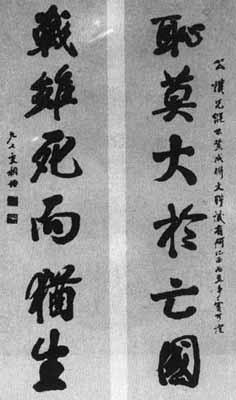 释义 | 行书六言联 【简介】: 现代·马良书。纸本。行书。凡上下联,共三十八字。刊于《民国时期书法》(中)。 【赏析】: 作者是一位差一年就生活了整整一个世纪的寿翁。此幅是书于一九三七年抗日战争爆发之时的作品。我们从黑白视觉中强烈感受到这位九十七岁的长者,在民族危亡的紧急关头,以笔作刀枪,挥笔写出的带血的吼声。 浏览作品,一种悲怆激愤之情跃然纸上,凝重的线条、顿挫的笔触,劲笔力墨之中包含著对贼寇的极度愤慨和与之血战一死的决心!在这种氛围里,平整的结体中也不乏傲崛之势,如“耻”、“虽”、“死”等字,颇能得势传神。激愤的怒火和纲铁的决心,这两种感情色彩交织成黑与白的构图,给人一种慑魂动魄的力量。 |