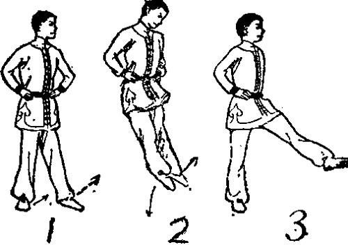 两腿微屈交替行走,称行步。行步时要求平稳,步幅均匀,重心不得起伏,不允许腾空。根据方向路线的各异,可分为前行步、倒行步、弧行步。
