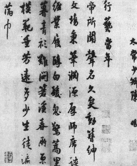【简介】: 宋·陈旸书。纸本。行书。尺牍一则。凡八行,每行字数不一,共六十二字。36.3×34.2cm。台北故宫博物院藏。爲《宋人法书册》中之一幅。《墨缘滙观》著录作《七言诗帖》。《石渠宝笈续编》著录。刊于台湾《故宫历代法书全集》(十二)。今载台湾《故宫书画录》卷三。 【赏析】: 此幅行书诗帖,扑面而来的是一股浓烈的唐人行书气息,与唐欧阳询的手笔十分相似,不同的是欧书在用笔上较含蓄滋润,体态上也较开张峻险,而此作稍逊之,但并不妨碍它在唐人行书气息上的到家程度。  作品结体在行楷之间,体态偏长而不俗,细密紧束而不闷:用笔方折利索,挺拔遒劲,向背分明,起承转折处顾盼有情;这些,均能使欣赏者在作品中获得重拙妍美的审美感觉。 |