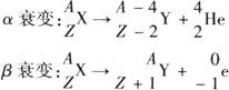 放射性元素的原子核,放出某种射线后,转变为新核的变化叫作原子核的衰变. 衰变有两种:α衰变和β衰变.而γ射线是伴随α衰变或β衰变辐射出来的.在衰变过程中电荷数守恒,质量数守恒. 1.α衰变.核内两个中子与两个质子组成α粒子放射出来,就是α衰变.衰变后的新核质量数比原来减少4,电荷数减少2. 2.β衰变.核内一个中子转化为一个质子和一个电子,这个电子从核内发射出来,就是β衰变,衰变后的新核质量数不变,电荷数增加1,新核比原来的核增加了1个质子,减少了1个中子. 衰变方程  A为原子核的质量数或核子数,Z为原子序数或核电荷数. |