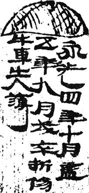 墨书木签。西汉时物。此签书风已尽脱篆意,字取横势,左右飘洒,用笔迅疾跌宕,与小篆谨缓之笔意迥然相异,已开东汉隶书之滥觞。