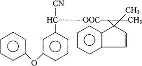 释义 | 西泊司林 C28H23NO3=421.49 CAS-60148-52-9 3,3-二甲基螺[环丙烷-i,i′[1H]茚]-2-羧酸,氰基(3-苯氧苯基)甲酯。 3,3-Dimethylspiro[cyclopropane-1,1′-[1H]indene]-2-carboxylic acid,cyano(3-phenoxyphenyl)methyl ester. 3,3-二甲基螺[环丙烷-1,1′-茚]-2-羧酸酯与间苯氧苯乙醇腈成酯。 3,3-Dimethylspiro[cyclopropane-1,1′-indene]-2-carboxylic-acid,ester with m-phenoxymandelonitrile. 杀虫药。 西波滋宁。 Cypothrin,Cl 206,797. USAN. |