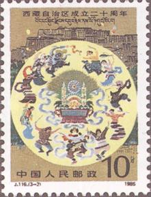 释义 | 西藏自治区成立二十周年 发行日期:1985年9月1日 齿孔度数: 印刷版别:影写版 票幅:30×40 全张枚数:50(10×5) 设计者:诸韬、高烽 印刷:北京邮票厂 (1)8分 兴旺 1510.76万枚 (2)10分 欢庆 1303.76万枚 (3)20分 丰收 1340.01万枚 (1)-(3) 3枚全 |