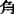 jiǎo 7画 角部 上下 象形字 QE 【笔顺】 角 【释义】(名) ❶ 牛、羊、鹿等头上长出的坚硬的东西:触~。 ❷ (名)古代军中吹的乐器:号~。 ❸ (名)形状像角的东西:菱~|皂~。 ❹ (名)几何学上称从公共端点的两条射线所组成的图形:直~|锐~。 ❺ (~儿)(名)物体边沿相接的地方:桌子一~|墙~。 ❻ (量)用于从整块划分出的角形的东西:一~饼。 ❼ (名)动物头上像角的东西。 ❽ (量)货币单位,一元钱的十分之一。 另见329页jué。 【角度】jiǎodù(名) ❶ 角的大小,通常用度或弧度来表示。 ❷ 看问题的出发点:不同的~。 [近义]方面 视点 [例句]这句话可以从多个角度来理解。 【角落】jiǎoluò(名) ❶ 两堵墙或类似墙的东西相接处的凹角。 ❷ 指偏僻的地方。 [近义]地方 [例句]他找遍屋子里的每一个角落,也没找到那本书。/消息传到祖国大地的每个角落。 |
