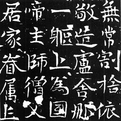 【赏析】:  从这件作品的搨片来看,碑表之石面较爲光洁,少剥泐,因而黑底白字,显得格外分明。书法用笔淸晰可见。应该说该碑作者的运笔技巧还是比较熟练的。富于弹性的笔势,在搨本上,颇有表现力,结字的朴拙和婀娜的笔致,恰好造成一种特有的艺术趣味。遗憾的是,在通篇结体上,却还显得不够统一,特别是“常”字和“属”字,在其中尤感不协调,似乎在一群个儿一般高大的壮小伙子中间夹进了两个瘦小子,不舒服。优秀的石刻书法,结字尽管大小不一,但行势和精神却能通篇浑然一体,我想这也许是康有爲能从浩如烟海的北碑中辨出良莠的一个重要标凖吧! |