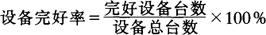 反映一个企业、一个车间设备总的技术状况的指标。 其计算公式为:  企业中常用的统计和考核指标是主要生产设备完好率,其计算公式为:  公式中,设备总台数包括在用设备、停用设备和在修设备,不包括尚未安装使用或由基建、物资部门代管的设备。主要生产设备是指修理复杂系数在5和5以上的设备。完好设备台数,是根据单项设备完好标准,进行逐台检查,确定完好后汇总得到的。 设备完好标准一般包括3方面内容:(1)性能良好。 如动力设备出力达到原设计标准(或国家法定领导机关批准的标准),机械设备精度能满足生产工艺要求,运转无超温超压现象。(2)运转正常,零部件完全,没有较大缺陷,磨损腐蚀程度不超过规定的技术标准;主要计量仪器、仪表和润滑系统正常。 (3)原材料、能源等消耗正常,无漏油、漏水、漏气、漏电现象。为了便于执行,各部门又制定了单项设备完好标准实施细则,作为检验设备是否完好的具体执行标准。 |