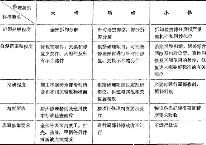 释义 | 设备的使用与维护保养 1.设备的使用 总的说来是合理、正确的使用设备:所谓“合理”是指加工的范围、幅度、深度、条件等要与使用的设备性能相适应;所谓“正确”是指操作的顺序、方法等要符合设备的使用要求。为此,需做到: (1)要提高设备的有效利用率,尽量使开动时间和利用强度达到满负荷。 (2)根据设备的性能、结构、制造精度、使用范围,恰当地安排加工任务,以延长设备的使用寿命。 (3)建立健全安全操作和维护保养等规程及润滑管理、凭证操作、交接班等制度。 (4)加强对操作者的培训和训练,以提高其对设备的“应知”、“应会”的水平。 2.设备的维护保养与修检 设备维护保养按其工作的广度、深度及工作量的大小,可分为日常维护保养、一级保养和二级保养(即所谓的“三级保养”,见表9-12)。设备检修包括定期检查和计划修理两部分。定期检查是由专业维修工人在操作工人参与下,定期对设备进行检查,查明另部件的实际磨损程度,以确定以后修理的时间和修理的种类。计划修理按其程度又可分为大修、中修和小修三类(见表9-13)。 表9-12 设备的维护保养 3.设备的润滑管理 按照一定的润滑技术、规范要求,对设备实行合理润滑所进行的计划、组织和控制。它是设备维护保养的重要工作之一。包括: |