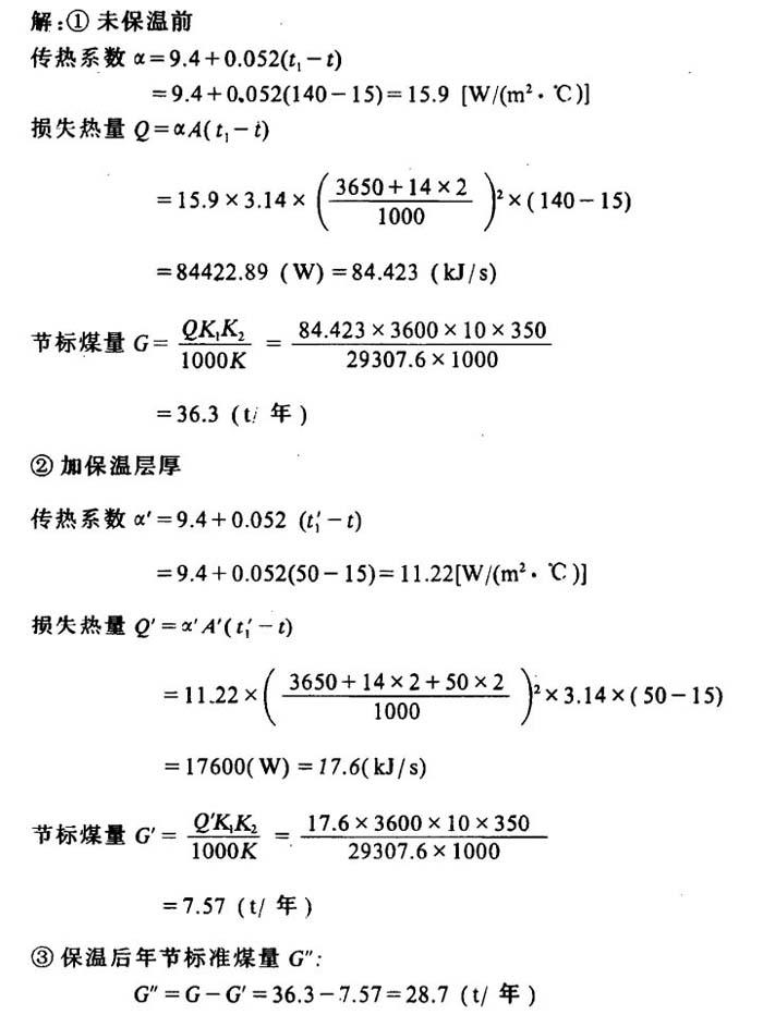 释义 | 设备的热损失计算及实例 1.一般计算 [说明]许多设备外壳壁面的温度通常高于周围介质的温度,故热量将由壁面以对流和辐射两种方式向周围散失。 式中 Q——总的热损失(W) x——对流、辐射联合传热系数[W/(m2·℃)] ❶ 空气作自然对流时 在平壁保温层外: 在管道或圆筒等容器壁保温层外: ❷ 空气沿粗糙壁面作强制对流时 当空气流速u<5m/s时: 当空气流速u<5m/s时: A.——设备外壁面积(m2) t1——设备的壁温(℃) t——环境温度(℃) α1——对流传热系数[W/(m2·℃)] α2——辐射传热系数[W/(m2·℃)] [例]用厂用25m3蒸球蒸煮原料,已知蒸球的内径为3650mm,球壁厚度为14mm,球内平均工作温度140℃,日工作10h,环境平均温度15℃。后加50mm保温层,球外壁温度为50℃,求保温前后的年热损失及折算标煤量。 2.近似计算 ❶ 外径d<1m的管道及圆筒形设备的散热量 式中 q——热损失[kcal/(m·℃)] tf——管内流体温度(℃) tα——周围空气温度(℃) ts——绝热层表面温度(℃) R1——见下式 λ——绝热材料在其平均温度下的导热系数[kcal/(m·h·℃) D1——绝热层外径(m) D0——管道或圆筒形设备的裸露外径(m) R2——见下式 x1——有风时绝热层表面至周围空气间的总给热系数[kcal/(m2·h·℃)]❷ 平壁及外径d>1的管道及圆筒形设备的散热量 式中 q′——散热量[kcal/(m·℃)] R1′——见下式 δ——绝热层厚度(m) R2′——见下式 其它同上 |