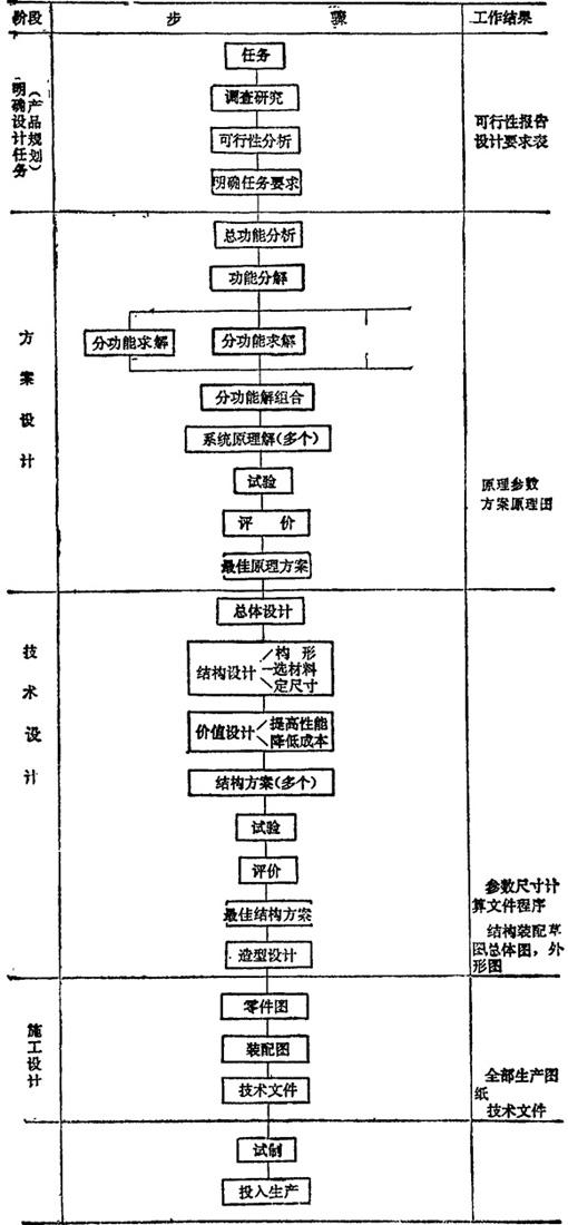 释义 | 设计的工作阶段 (1)产品规划阶段 产品规划阶段主要进行产品需求分析、市场预测、可行性分析,确定设计参数及制约条件,最后给出详细的设计说明书(或要求表),作为设计、评价和决策的依据。 对产品开发中的重大问题经过技术、经济、社会各方面条件的详细分析和对开发可能性的综合研究,提出产品开发的可行性报告。其报告内容一般包括:1.产品开发的必要性,市场调查及预测情况;2.有关产品的国内外水平、发展趋势;3.从技术上预期所能达到的水平,以及经济效益和社会效益的分析;4.从设计、工艺等方面需要解决的关键问题;5.投资费用及时间进度:6.现有条件下开发的可能性及准备采取的措施。 产品规划的最终形式是确定设计任务,并给出详细的设计任务书(要求表),其内容参见表3.1-1。设计任务书应在产品功能、经济性、制造、使用、期限等方面提出明确的要求,并尽可能数量化。反映基本功能性能的要求应列为设计的基本要求,而对制约条件可分为必达要求和附加要求,区别其重要的程度,以便评价时给予适当的加权系数。 表3.1-1 设计任务书(要求表)参考内容 注:表中应给符号注明基本要求、必达要求及附加要求。 (2)方案设计阶段 方案设计是在澄清任务书后,通过抽象化来认识设计的本质问题,建立功能结构,并且通过寻求合适的作用原理,将其组合成作用结构,确定最佳的原理解。这一阶段是决定产品性能、成本,关系到其质量水平及竞争能力的关键,要求充分发挥创造性,掌握系统化设计方法,并且能够利用技术、经济评价的方法进行合理的决策(详见本章第4节)。 (3)技术设计阶段 技术设计是由作用结构或原理解出发,按照技术和经济的观点,明确、完整地确定技术产品的组合结构。其工作内容就是产品的结构设计,包括总体、部件的布置、构形和尺寸参数的校核、计算和优化。技术设计的结果是设计方案的结构确定,包括按比例的总图、部件图和分析计算说明书等。 技术设计是一个不断反复思考和检查的过程。要求设计出的产品作用明确,结构简单、安全可靠;在满足基本技术功能的基础上,应有足够的强度、刚度、使用寿命,以及要求的耐高温性、抗腐蚀性、高速稳定性、宜人性(低噪音、外形美观、操作舒适等),具有良好的加工、装配工艺性,并且成本低廉,便于运输、使用、维护、回收等。 技术设计包括总体设计、结构设计、商品化设计、模型或样机试验等内容。在技术设计阶段,往往要绘制草图,进行参数分析计算,并且进行技术、经济的评价和决策。 (4)施工设计阶段 施工设计是在技术设计阶段确定的产品组合结构基础上,完成交付生产以前所必须的一切技术文件,包括零件工作图、部件装配图、设计说明书、使用说明书、加工工艺文件、装配、运输规程等。施工设计所提供的文件是整个设计的最终结果,应当满足设计任务书所提出的各项要求,并且在细节上达到具体、完善的地步。 表3.1-2给出了产品设计的一般进程。 表3.1-2 产品开发的一般进程 |