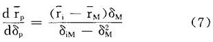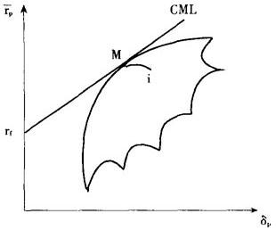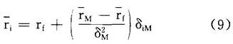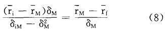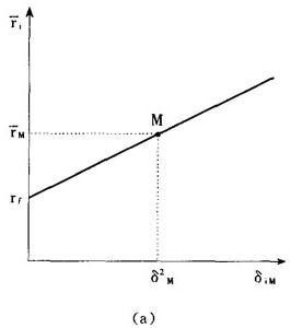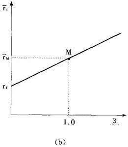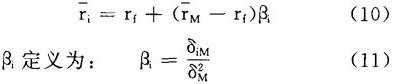 如图1,以证券组合的预期收益率rp作纵坐标,以证券组合的标准差δp作横坐标,绘出证券组合的可行集和资本市场线。 在可行集里,存在各种单一风险证券,任意选择一种证券,用i表示。设想一证券组合,用P表示,它包含证券i的投资比例是Xi,市场证券组合的投资比例是(1-Xi),这种证券组合的预期收益率等于:  和标准差等于:   图1 推导证券市场线 首先在(1)中,求rp对Xi的导数:  其次在(2)中,求δp对Xi的导数:  再次,考虑曲线iM的斜率,有如下表达形式:  最后,把(3)和(4)分别代入(5):  在曲线iM的端点M处,Xi=0,可计算出曲线iM的端点M处的斜率:  在点M处,资本市场线的斜率必然等于曲线iM的斜率,因此  解方程(8),#i等于:  它表明了单一一种证券资产的风险和收益率之间的均衡关系,分别以证券的协方差风险δi和预期收益率ri为横坐标和纵坐标,在图2-a中,方程(9)代表具有截距rf和斜率[(rM-rf)/δ ]的一条直线,证券的协方差风险δiM和预期收益率之间的这种关系称为证券市场线。 证券市场线的另一种表达方式如下:  βi项称为证券i的β系数,它代表一种证券的协方差风险。 如果以证券的预期收益率 i为纵坐标,以βi为横坐标,则证券市场线也可以表现在图2-b中。  图2-a 协方差观点  图2-b β观点 |