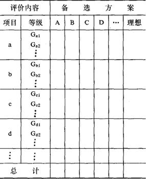 释义 | 评分法 直观判断法中的一种最常用的方法。 根据评价对象的具体情况,选定评价项目。并对每个评价项目制订出评价等级和评分标准,然后以此为基准,由有关专家和技术人员对各个评价项目进行打分,最后,经过一定的运算求出各方案的总分,从而确定方案的优劣。 其评分表一般形式如表所示。 根据评价项目的评分等级和评分计算方法的不同,可以把评分法分为加法评分法、连乘评分法、加乘评分法和加权评分法等形式。 表 评分表的一般形式(空格内填所得分数) |