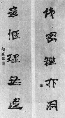 【简介】: 现代·徐生翁书。纸本。行书。五言联。凡上下联正文十字,款三字,共十二字。刊于《中国书法》一九八七年第三期。 【赏析】: 毋庸置疑,中年时期生翁的书法艺术,已臻相当水凖。然后一种对于艺术眞谛执拗的追求精神,对于书法渊源寻踪探本的意志,使徐生翁踏上了更进一步的探源之路。从篆籀用笔中体味法书的韵律;从殷墟文字中寻觅人与大自然相搏的痕迹;从靑铜铭文中汲取线条的组合画和字的精髓,一切源于自然而又复归于自然。“因以画意作书,天地万物,无一非书画粉本,于是以造物爲师,融书、画一炉而冶之。”由于徐生翁深厚的功力和超然的领悟,一种天眞可爱的书风终于从炉火纯靑的铸炼中脱頴而出。如五言联“识密鑒亦洞,意惬理无违”,何等超脱,又何等憨态可掬,是一杰作。 徐生翁此作,功力深厚,风格奇特,匠心独运。是熔秦、汉魏碑爲一体的奇逸浑雄自成一格的力作。其用笔拙实涩辣,而又灵动自然。笔到之处变化精微,字体结构精整茂密、纵敛之中异趣顿生;虽字字独立,但字势安排倾侧相顾,且又整体气息相通、和谐统一。具体地说:作品中“密”字,其“宝盖”右角转处,取篆书之圆转用笔增加了此处的力度,使之更浑厚,同时又使此字的整体更统一。而“识、鑒”的转处则以简书、章草的笔法出之,这些现象在徐生翁有意追求的创作中随处可见,并且处理得恰到好处,这是与他对这一门类艺术的变化掌握的极其精熟密不可分。 徐生翁对书法艺术的理解,正是他所书联语(识密鑒亦洞,意惬理无违)中的那种出规入矩而又超然脱俗,个人精神的追求。 他取法得汉、魏,趣味特异,雄强静穆,表现风格属于简括、拙实苍茫一路,在他作品中一扫淸初碑派书风流于太狂放之弊。正是由于他对书法艺术精深的领悟和其超然脱俗的胆识,决定了他书法艺术创造上的成功。