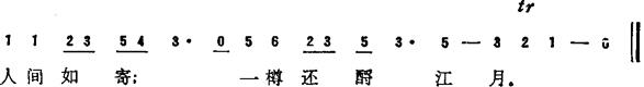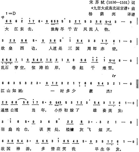 词的音乐部分。 词是曲子词的简称,它包含曲和歌词两部分。词乐是指曲而言。 概言之,词乐指音、律、宫调、词牌几部分。音指七音:宫、商、角、变徵、徵、羽、闰。律指十二律:黄钟、大吕、太簇、夹钟、姑洗、中吕、蕤宾、林钟、夷则、南吕、无射、应钟。宫调指燕乐二十八调中的七宫十二调:正宫、高宫、中吕宫、道宫、南吕宫、仙吕宫、黄钟宫和大石调、双调、小石调、歇指调、商调、越调、般涉调、中吕调、正平调、高平调、仙吕调、羽调(即黄钟羽)。 词牌是指词的曲调名称,据《钦定词谱》记载,有826调,2306体。宋代词乐有其独自的特点,其一是参差不一的乐句结构。 宋词配有曲谱歌唱,它与汉魏乐府诗、古诗、唐格律诗的方整性句式结构不同,由于它的每个词牌的文学句式长短不同,因而乐句结构的变化亦非常复杂,参差不一。这种长长短短的乐句结构,更适于表现细致复杂的感情变化。因此它很快就被新兴的说唱、戏曲艺术所吸收。它的产生对于我国音乐的发展有著极为重要的影响。 其二,宋词在音调上也有自己的特点。1.其音阶形式基本上属于杂用清角(4)与变徽(#4)的汉清乐音阶,但有时也用降七级音b7(闰)音的唐燕乐音阶。一般来讲,旧音阶的宫、羽调式较为常用。有时也用徵调式、商调式和角调式。 2.其转调手法,常转上下四度的近关系调。有时也转大二度调。3.在旋律进行上,三度的进行较为常用,特别是在乐曲开头和结尾。如《扬州慢》的135,《愿成双令》、《凄凉犯》的357,《杏花天影》的461等。还有176或5#43等小三度下行级进的典型音型与五度、六度跳进,如 与 的进行等。 此外,变化音#1、#2、#4b7的运用也很有特色。如《杏花天影》即其典型一例:  总之,宋词音乐由于有自己的特点,所以形成了独特的风格,在当时产生了极为广泛的影响。附苏轼《念奴娇·赤壁怀古》词谱。 念奴娇