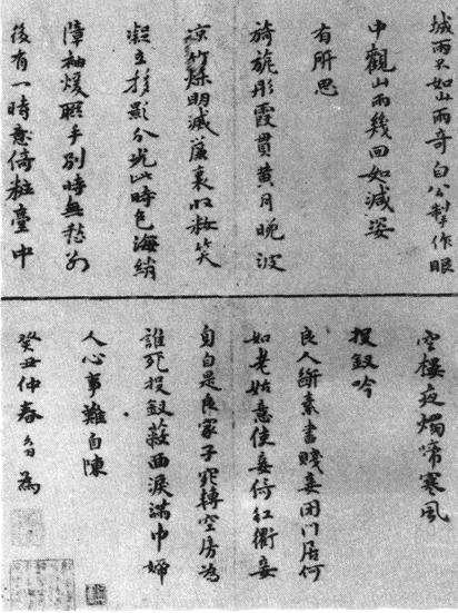 释义 | 诗词册 【简介】: 明·祝允明书于弘治六年(1493)春。纸本。楷书。凡四十行,共六开,每开21×26.1cm。故宫博物院藏。刊于《中国古代书画图目》(一)。 【赏析】: 此册小楷从锺书来,线条欹侧,粗细似无常规,笔触行气,不求工整,下笔率意,宁拙毋巧。 试以祝书之《书唐宋四家文》、《出师表》、《招凤辞跋唐寅画后》、《宋玉诗赋册》、《六体诗赋》中之《古风》等比较一下,此册似嫌剑拔弩张,不够厚重浑朴,似尙未达祝氏所称“劲易而圆难”中“圆”的境地。 |