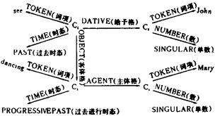 释义 | 语义网络理论 表示词与词之间语义关系的一种理论。由美国人工智能专家西蒙(R.F.Simmons)提出。其原理是以句中词的概念为网络的结点,以沟通结点之间的有向弧来表示概念与概念之间的语义关系,构成一个彼此相联的网络,从而求得对自然语言的句子的语义理解。如“John saW Mary dancing(约翰看玛丽跳舞)”这个英语句子可用语义网络表示如下: |