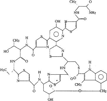 C51H43N13O12S6=1222.34 CAS-56377-79-8 N-[1-(氨基羰基)乙烯基]-2-[14-亚乙烯基-9,10,11,12,13,14,19,20,21,22,23,24,26,33,35,36-十六氢-3,23-二羟-11-(1-羟乙基)-31-甲基-9,12,19,24,33,43-六氧代-30,32-亚氨基-8,5∶18,15∶40,37-三次氮基-21,36-([2,4]-内-噻唑亚甲基亚氨基)-5H,15H,37H-吡啶并[3,2-w][2,11,21,27,31,7,14,17-苯并噁四硫杂三氮杂环三十六碳烷-2-基]-4-噻唑甲酰胺。 N-[1-(Aminocarbonyl)ethenyl]-2-[14-ethylidene-9,10,11,12,13,14,19,20,21,22,23,24,26,33,35,36-hexadecahydro-3,23-dihydroxy-11-(1-hydroxyethyl)-31-methyl-9,12,19,24,33,43-hexaoxo-30,32-imino-8,5∶18,15∶40,37-trinitrilo-21,36-([2,4]-endo-thiazolomethanimino)-5H,15H,37H-pyrido[3,2-w][2,11,21,27,31,7,14,17]-benzoxatetrathiatriazacyclohexatriacontin-2-yl]-4-thiazolecarboxamide. 抗生素类药,生长刺激药(动物)。 Nosiheptide,RP 9671,Nosipeptine,Multhiomycin,Primofax. INN,BAN,USAN.  |