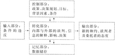 释义 | 谈判 在既定环境下,多方达成的一致条件与平衡遭破坏,再行商量解决分歧和矛盾的过程。 其一般模式由五部分组成(如图)。其中关键是转化部分,这也是谈判的过程。输入的信息被编码总结、分类从而作出决定。 在这一部分,更为关键的是信息解释(包括收集)、影响与决策。 控制部分包括政策、决策规划及目标。谈判时,这些规划通过组织间的协商而产生一个详细的目标。效果的反馈也很重要,即谈判各方应保持长期的联系。 |