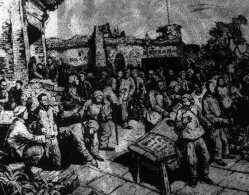 【作品赏析】: 此图也作于1948年土改前后,解放区实行民主政治,经过充分酝酿后,由群众直接选举自己的村干部。 “豆选”即一种有趣的投票方式。候选人站在桌子前面,身后的桌面上放著一个碗。投票的人依次走过桌子,凡赞成的就在碗里放颗豆。 老乡们不论男女老少,是否认字,都可以在自己十分熟悉的候选人身后投或者不投一颗豆,行使自己的民主权利。 画面描绘一个有高门楼的大院,人们都高高兴兴来投豆,有的在发“选票”(豆),有的坐在一边监投,有的一边投豆,一边拈须思忖著。候选人有男有女,有老年也有青年,还有抱孩子的。他们有点腼腆,还有人在跟他们谈话。远处墙上有黑板,正有人在黑板上写著候选人名单,准备投豆完毕后唱票。 一杆红旗在空中飘扬,房顶上架著一口大钟,那是为召集村中人开会才使用的通讯工具。场面上的气氛和谐而严肃。画家用一杆雕刀,为我们描绘下了这个有历史意义的场面。 。  现代 彦涵 黑白木刻 纵28厘米 横35.5厘米 |