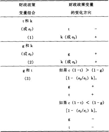 利用这些模型可以推导出维持总需求和总供给的平衡所需要的基本条件。假定在(t-1)时期,当Ot-1=Yt-1时,总需求正好与总供给相一致。 这样,按照(7)式,该时期的民间投资额就必须是:It-1=[1-c(1-t)-g]Ot-1。而且,根据(8)式可知,同期的政府投资额 将此式代入(6)式,并用Ot-1去除(6)式的两边,得到: 现在再以g0是既定的为前提条件,说明改变其他财政政策参数的影响。如果提高宏观税率,国民支出增长率曲线将向下方移动,充分就业增长率曲线向上方移动。因此,适当地提高税率(t),就能使这两个增长率在原政府支出比率(g0)下一致。这时,均衡增长率由Gk′曲线和Ge′曲线所决定,即g0d。 提高政府投资产出系数(σ2)或政府投资比率(k),Ge曲线不变,而只是Gk曲线向上移动。新的充分就业增长率(Gk″)曲线与不变支出增长率(Ge)曲线相交,二者政府支出比率(g0)不变的情况下保持一致。这时,均衡增长率由Gk″曲线和Ge曲线所决定,即g0a。 上述四种典型的财政政策措施,实际上可以作适当的组合,从而形成众多的有效措施。 选择其中任何一种措施,均衡增长率都会取不同的值。例如,在图1中,如果适当地降低一些税率的提高幅度,同时降低政府支出比率,那么,这种政策的组合使得新的Ge′曲线和Gk′曲线在g0与g1之间相交。又如,降低政府支出比率,同时提高政府投资比率或政府投资产出系数,那么,新的充分就业增长率曲线Gk″就会在g0与g1之间与不变的支出增长率(Ge)相交。在这种情况下,均衡增长率只能取g1c与g0a的中间值。 若附加g=t这样的约束条件,也就是实行平衡预算政策,这时,支出增长率Geb一般与各财政政策变量无关。 但在这种情况下,通过移动充分就业增长率 例如,如果必须提高充分就业增长率Gkb,可根据σ1(1-c)与σ2k的大小缩小或扩大平衡预算规模。当然,也可通过提高或降低政府投资产出系数或政府投资比率,提高或降低充分就业增长率。 此外,由于税收结构不同对民间消费、民间储蓄以及民间投资的影响也不同,政府可以利用不同的税种组合促进均衡增长率的实现。例如,降低公司所得税税率和提高支出税税率相配合。 这种措施在抑制民间消费的同时刺激了民间投资,支出增长率不变,但充分就业增长率会有所提高。 5.实现最优经济增长的财政政策 最优经济增长率 西方经济学家认为,通过重点不同的财政政策,可以使充分就业增长率和支出增长率保持一致,实现均衡增长率。但是,不同的稳定政策措施可以实现各种均衡增长率,政府到底应当选择何种高度的均衡增长率作为政策目标?这个问题就是所谓的“最优增长率”。 就拥有能够实现充分就业所需资本的经济发达社会来说,要长期维持充分就业,国民生产也必须以超过一定比率的速度增长。 这是因为,不仅劳动人口具有增加趋势,而且劳动的平均生产效应还会随著技术进步和劳动力质量的提高而上升。假定劳动力人口为N,人均产出量为O,充分就业的实际国民生产总值为Yf,则Yf=N·O。由此式可得: 也就是说,充分就业下的实际国民生产总值增长率等于劳动力人口增长率加上生产增长率。哈罗德称之为“自然增长率”(natural rate of growth)。 如果均衡增长率和自然增长率正好相等,那么,至少作为一种长期倾向,生产设备和劳动力两方面都得到充分就业的理想的经济增长过程就会出现。因此,西方经济学家认为,如果经济中存在大量潜在失业人口,最优经济增长率就是能够达到的最大的均衡增长率;如果经济中没有潜在的失业,则自然增长率就是最优增长率。 实现最优经济增长的财政政策措施 按照以前的分析,最优经济增长率就是在充分就业增长率、支出增长率以及均衡增长率(G*)这三者相等的情况下(即Ge=Gk=G*),均衡增长率达到所期望的高度。 西方经济学家认为,在上述四个财政政策变量中,只要同时适当地变动两个以上的变量,就能使充分就业增长率和国民支出增长率按同一方向变化,实现最优经济增长率。 如果财政政策的目标是使均衡增长率达到一定的值,政府应采取的各种财政措施及其组合如表2所示。 表2 实现最优增长率的财政政策 (1)降低税率,提高政府投资比率或政府投资产出系数。 在这种政策措施组合下,国民支出增长率只受税率下降的影响,也就是说,税率降低会明显提高国民支出增长率。但与此同时,税率降低对充分就业增长率的提高有负效应。 国民支出增长率提高了,充分就业增长率必须同时提高,这时就必须提高政府投资比率或政府投资产出系数,以便抵消税率降低对充分就业增长率带来的不良影响。为了使这种政策搭配合理,应尽可能降低有利于刺激民间投资的税率。 最有效的方法是降低公司所得税,如对公司保留利润减免税,实行投资税收抵免等。特别是在公司企业投资对税收负担的变化反应非常灵敏的时候,将公司所得税的减免与消费税的增税结合,一方面降低消费占国民收入的比率,另一方面提高充分就业增长率,从而实现最优经济增长。 (2)提高政府支出比率、政府投资比率以及政府投资产出系数。这项政策组合的实质是提高政府支出占国民收入的比率的同时,提高具有较大产出效应的政府投资所占的比重,降低政府消费所占比重。 这种政策组合主要用来影响充分就业增长率。这三项措施之所以都是增加趋势,是因为政府支出比率的变动与政府投资比率、政府投资产出系数的变动对充分就业增长率的