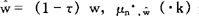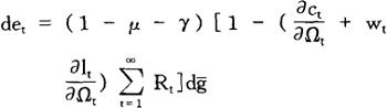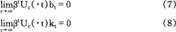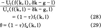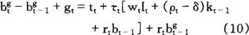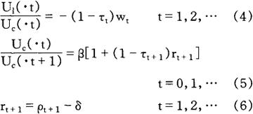 方程式(4)确定闲暇与消费间的边际替代率等于扣税后的边际劳动力产量。方程式(5)表明,个人调整其消费格局,从而当期消费与未来消费间的边际替代率等于税后主观债券折现收益。 方程式(6)表明个人改变资本存量,以使扣除折旧后的资本收益等于债券收益。 此外,横截性条件(transversality conditions)