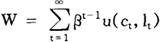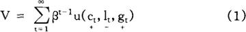 式中,β代表主观折现因子(subjective discount factor),0<β<1,c代表物质消费,l代表工作努力,g代表政府的产品和劳务支出。假定消费和工作努力分别提供效用和负效用;政府支出增加私人效用,或作为私人消费品的替代品(如学校午餐、图书馆的图书)或作为闲暇活动的互补品(如公园、观景轻便铁路)。 行为主体获得规模收益不变的生产技术,