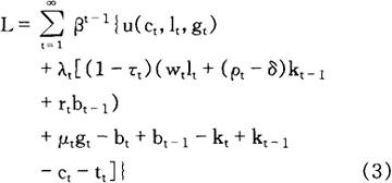 =wtlt+ρtkt-1+μtgt (2) 式中,kt-1是t时期开始时已积累的物质资本,wt是边际劳动力产量,ρt是边际资本产量,μt是公共部门提供的边际产品和劳务产量。由于在私人生产过程中的某些公共投入(如警察服务、公路等)很可能增加生产,而其他投入(如污染控制、职业安全制度等)很可能会降低生产,因此,μ的符号一般来说不明确。 给定这种生产过程,行为主体在t时期的预算方程式如下: (bt-bt-1)+(kt-kt-1)+ct+tt =(1-τt)[wtlt+(ρt-δ)kt-1+rtbt-1]+μtgt (3) 式中,bt-1是行为主体在t时期开始时已积累的债券(私债或公债),t是一次总付税,τ是对来自劳动力、资本(扣除折旧费)和有价证券的所得课征的比例税率。 为简便起见,公共部门提供的投入,其所得不计入税基。该预算约束表明,在t时期可利用的资源或用于储蓄,或用于消费。 尽管该模型涉及到很多抽象概念,但我们仅特别说明三个方面。第一,该公式包含家庭部门的消费和生产决策,故忽略了对个人所得和公司所得的不同税收待遇而可能产生的复杂情况。 税收效应仅限于对应税所得课征一般的比例税率τ。布劳克和特诺夫斯基(Brock and Turnovsky,1981,p.179-209)以更为一般的模型(该模型包含更复杂的税制结构以及消费的效用最大化问题和企业的价值最大化问题)讨论了下述的某些问题。第二,典型的行为主体按其具有无限计划期界(infinite planning horizon)来建模。一方面,尽管个人不是无限寿命的,但倘若折现率是合理的,他们的计划期界也许足够长,为抽象无限计划期界提供了一种良好的近似;另一方面,倘若存在著代际间的馈赠链,有限寿命的个人实际上可能具有无限计划期界。第三,私债和公债假定在行为主体的有价证券组合中是完全替代的。波劳瑟(Blosser,1982,p.325.352)研究公共融资决策对超额债券收益的影响时所得到的经验结果表明,这种假设并非过于严格。 行为主体问题的最优性条件(optimality conditions)可依据拉格朗日函数获得: