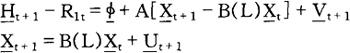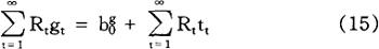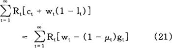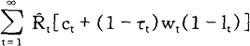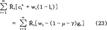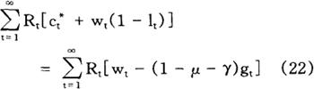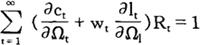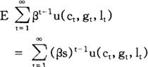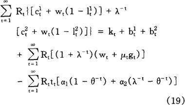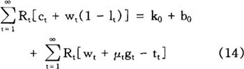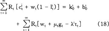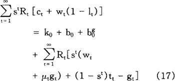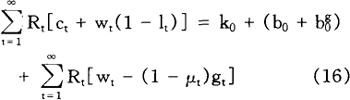 加到行为主体问题上,以便排除行为主体增加当期消费而不遭受在将来某一时点减少消费之苦的可能性。 给定初始条件c0=c0,10=l0,k0=k0,b0=b0,方程式(2)和(4)~(8)就足以保证(3)式给定的个人问题的最优化,也就足以确定个人在所有时期(t=1,2,…)对消费、工作努力、资本存量以及债券取得的选择。 利用(3)式和(6)式,我们很容易求得行为主体的跨时预算约束(intertemporal budget constraint):