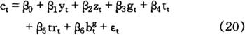 注意该表达式的最后一项,是税收现值。α1(1-θ-t)是有可靠担保的个人的财富损失,是政府决定干预贷款市场的结果。 α2(λ-t-θ-t)反映出无可靠担保的个人(可能)获得的净利得,条件是公共部门的交易成本低于私人部门经纪人的交易成本。于是,公债政策对总财富的影响关键取决于下式的符号: [α1(1-θ-t)+α2(λ-t-θ-t)] 如果是负的,其效应就是增加财富。如果λ=θ>1,从而从边际角度来看,私人和公共“贷款”的成本相当,减税可能会降低财富,因为这相当于在交易成本为正的情况下向私人部门强制贷款。 显然,公债政策增加财富的必要条件(但不是充分条件)是:θ<λ,从而公共部门的金融媒介活动比私人部门的金融媒介活动更有效,这或许是由于保证“贷款偿还”的政府征税权所致。 不过,如果这是激进主义财政政策的全部理由,一个更为合理的政策应当是让政府明确地向无可靠担保的个人直接贷款,因为这种政策会避免给不得不参与债务发行政策的、有可靠担保的个人造成无谓损失或沉重损失(deadweightloss)。 2.4 债务中性的经验证据 试图确定公共融资政策是中性的大量经验研究一直集中于考察其对消费行为的影响。 例如,科秦(Kochin,1974,p.385-394)、泰纳(Tanner,1979,p.214-218)、费尔德斯坦(Feldstein,1982,p.1-20)以及科曼迪(Kormendi,1983,p.994-1010)等,这些研究通常都是以下列一般形式的方程为基础: