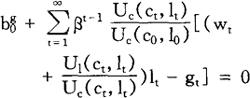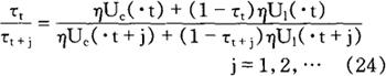式中,η的定义是: ηUc(·k)=(Uc(·k))-1(ckUc,(·k) -lkUlc(·k)) ηUc(·k)=(U1(·k))-1(lkUl1(·k) -ckUc1(·k)) 因此,相对税率取决于消费的边际效用与工作努力的边际负效用的加权弹性和的相对值。 现在,研究税率在整个时间内应当相等的情况。 首先,假定t时期和t+j时期的生产率相等(wt=wt+j),公共支出相等(gt=gt+i)。(24)式中的税率彼此应相等。 其次,假定效用在消费和工作努力是加性可分的,且消费的边际效用不变,则(24)式缩减为:
